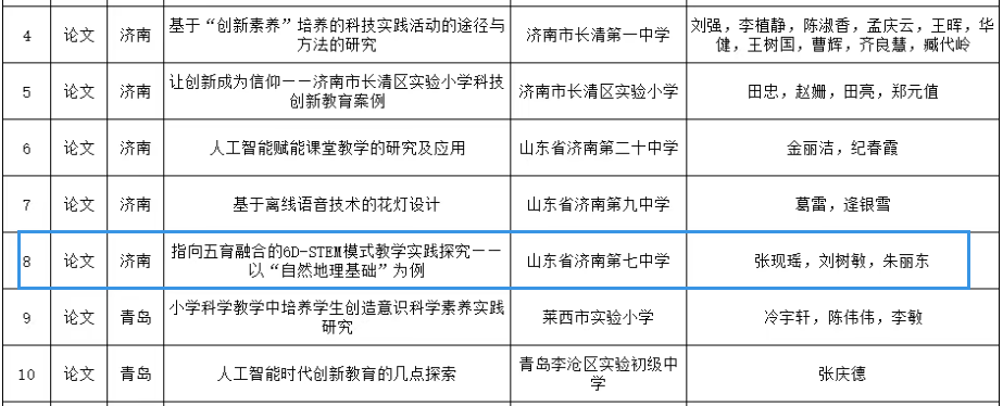 近日,山东省电教馆公布山东省中小学“科创教育优秀成果”评选结果,济南七中地理组张现瑶、刘树敏老师的研究论文《指向五育融合的6D-STEM模式教学实践探究——以“自然地理基础”为例》经学校推荐、市级推选、省级评审,成功获评省级优秀成果。该成果发表于全国优秀地理期刊《地理教育》2024年第9期(封面文章),是济南七中市级地理学科基地的建设成果,也是学校深化科学教育发展的重要体现。