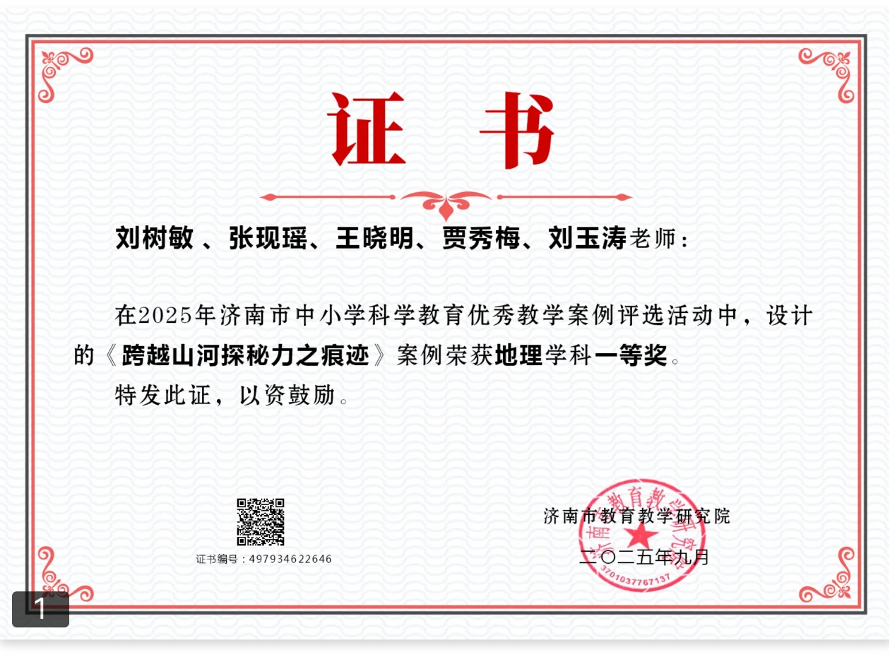 其中,刘树敏老师团队的《跨越山河探秘力之痕迹》荣获地理学科一等奖第一名,张衍洁老师团队的《生态系统的能量流动》荣获生物学科一等奖,杜丽萍老师的《搭建你的专属智能体》荣获信息技术学科二等奖,杨宁老师团队的《收集创意的方法——植物染图案设计》获通用技术三等奖,这些成果的取得充分展现了七中在科学教育领域的扎实积累与创新实力。 济南七中始终高度重视科学教育,打造“七彩格创”科学教育体系,以“务实创新、协同育人”为核心,积极推进课程改革与资源整合。学校不仅开发了《校园里的科学》等校本课程,还大力推进STEAM教育、实验教学与研究性学习,构建“校内+校外”双场域协同机制,依托“大中小幼”科学教育联合体,开展跨学段、跨学科项目合作。此外,学校积极引入人工智能教育,举办科技节等活动,为学生搭建丰富的科创实践平台。 此次获奖不仅是对教师教学创新和专业能力的充分肯定,更是济南七中科学教育成果的集中体现。获奖案例融合学科核心素养与数智化手段,注重实践探究与跨学科整合。学校将以此为契机,进一步深化科学教育课程建设,强化师资培养,拓展资源平台,推动科技创新教育高质量发展,持续打造具有七中特色的科学教育品牌。 初审:张现瑶 复审:亓莹 终审:王莉惠