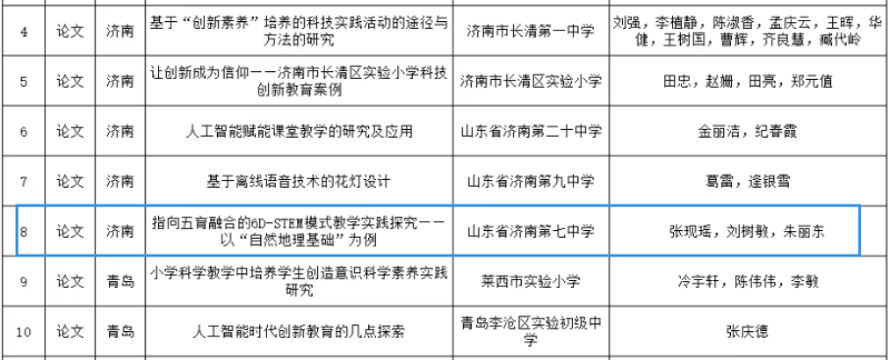 近日,山东省电教馆公布山东省中小学“科创教育优秀成果”评选结果,济南七中地理组张现瑶、刘树敏老师的研究论文《指向五育融合的6D-STEM模式教学实践探究——以“自然地理基础”为例》经学校推荐、市级推选、省级评审,成功获评省级优秀成果。该成果发表于全国优秀地理期刊《地理教育》2024年第9期(封面文章),是济南七中市级地理学科基地的建设成果,也是学校深化科学教育发展的重要体现。