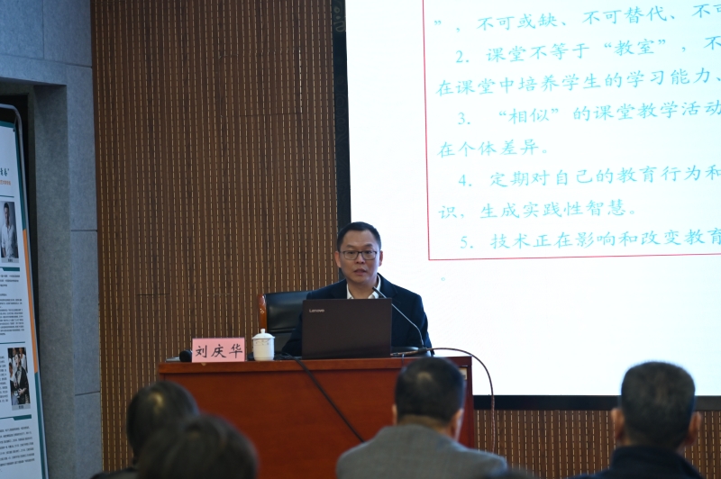 刘庆华院长基于课堂对教师成长与学生学习的重要作用,分别以“学习:读书可以医愚”“课堂:越是艰难越向前”“素养:非专业中走向专业”“思考:做课堂观察的问题中人”“研究:给做法找个说法”为标题,从五个方面,分享了对教师实现专业成长,实现自身改变和突围的认识。 刘院长结合自身经历,从多个维度剖析教师专业成长路径,强调教师要持续学习,在教学上要大胆泼墨,细心收拾,把学生放在课堂中央,通过变革教学方式提高学生课堂学习效率。他以公开课为例,分析了让一堂课上得有分量、让教学成为一种艺术的六个要素,即“真实”“思考”“尊重”“换位”“效果”“反思”;指出涵盖课堂思维含量、教学方法针对、知识结构化处理程度等方面的十个问题,并结合调研结果,指出好老师及好课堂的标准。“这里就是罗德岛,要跳就在这里跳吧!”,讲座最后,他用寓言故事激励在座教师,始终保持对教育的热爱与敬畏,不断学习,不断成长。 此次讲座着眼于青年教师专业成长的关键点,提供了明确的动力点,使老师们深受启发和鼓舞,坚定了不断探索,稳扎稳打,主动成长的决心与信心。 初审:孙玥 复审:鲁柯新 终审:王莉惠